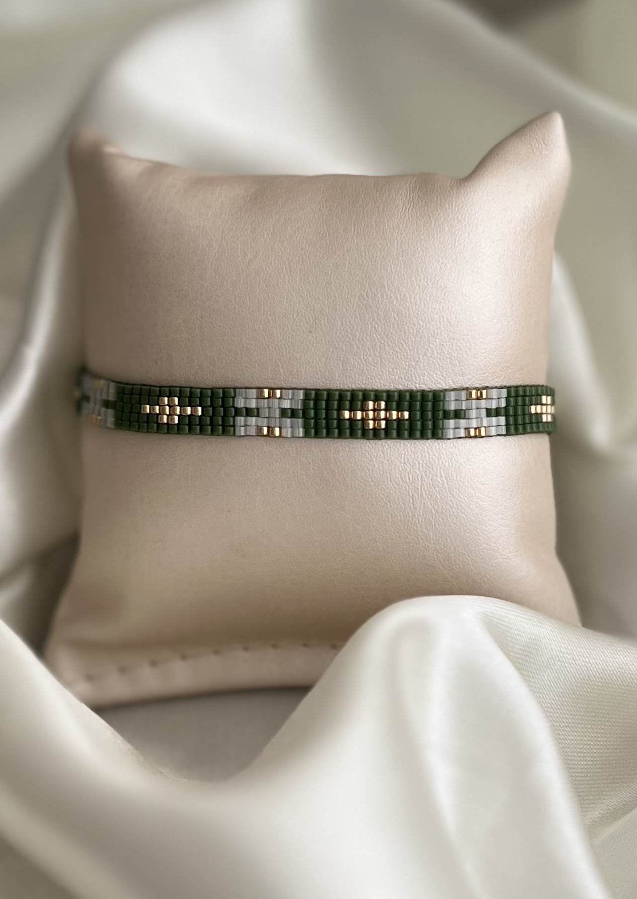 Pulsera tejida a mano con delicadas cuentas de vidrio Miyuki. Diseño lineal con sutiles acentos dorados. Cuentan con cierre ajustable en nudo macramé, elaborado en hilo coreano para un ajuste cómodo y seguro.